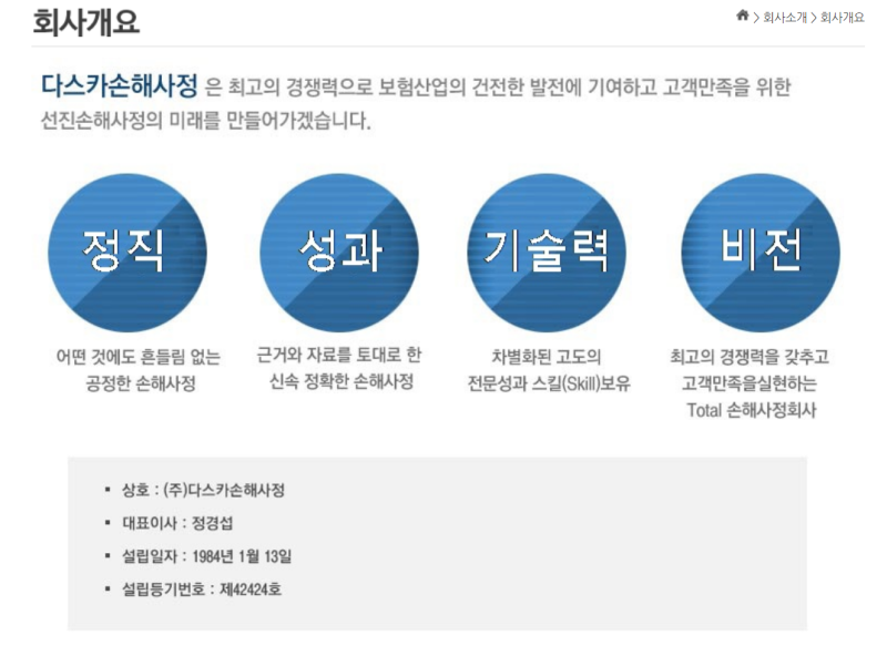 - 주요 사업: 자동차보험 손해사정, 화재보험 손해사정, 배상책임보험 손해사정, 근재보험 손해사정