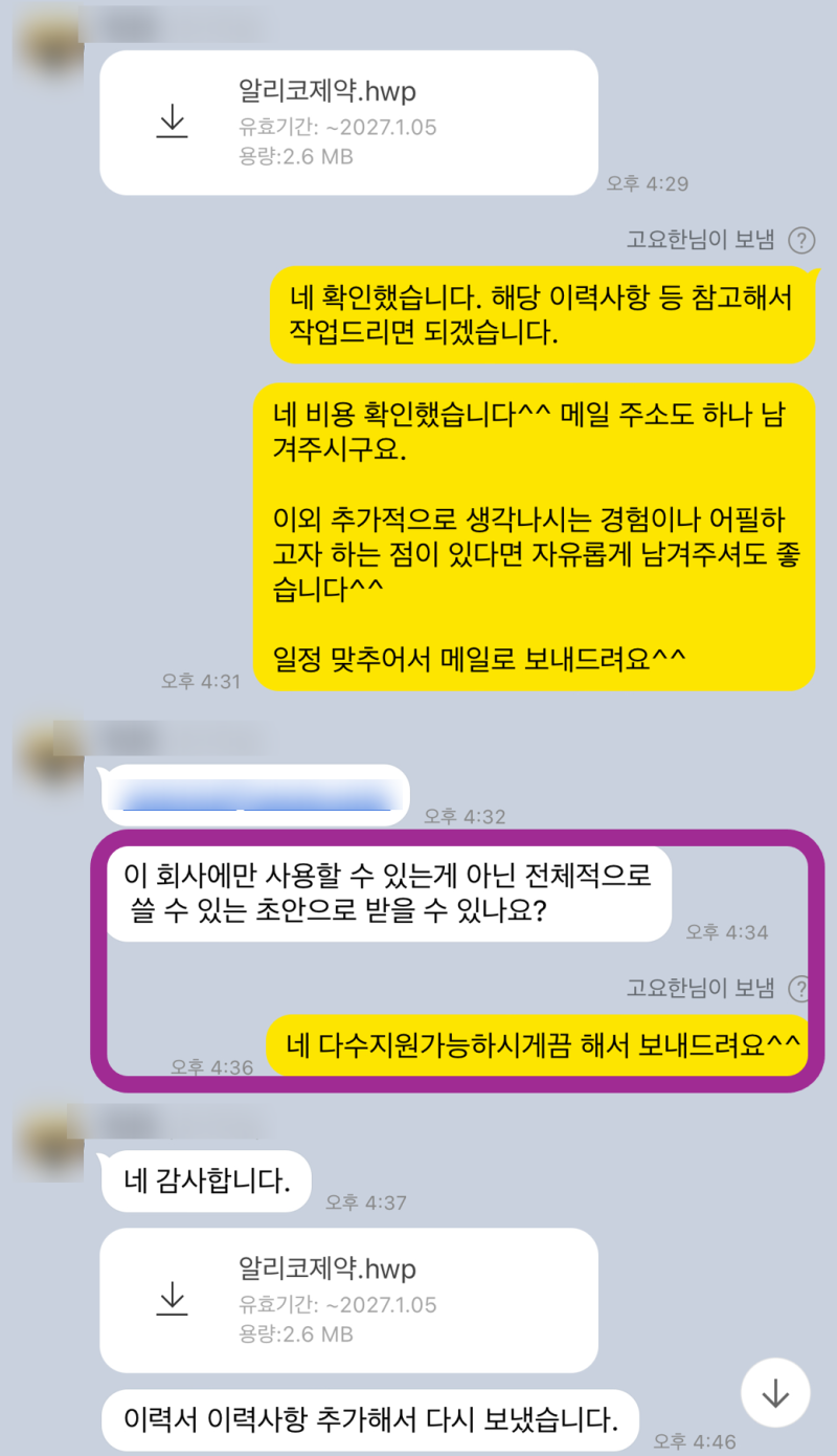 각 단계별로 지원자분과 긴밀하게 소통하며 첨삭을 진행했습니다. 특히, 지원자분의 경험을 알리코제약의 가치와 연결하는 데 집중했습니다.
