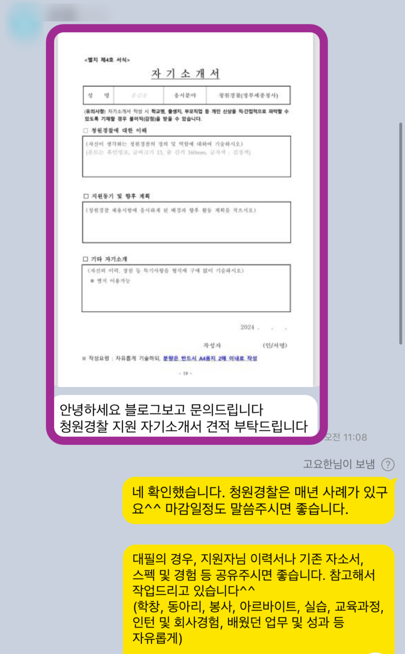 여러분도 꿈에 그리던 청원경찰 합격의 주인공이 될 수 있습니다. 혼자 고민하지 마시고, 전문가의 도움을 받아보세요. 꼼꼼한 첨삭과 맞춤형 대필, 그리고 실전 면접 컨설팅까지! 여러분의 성공적인 취업을 위해 모든 노하우를 아낌없이 제공해드리겠습니다. 🚀 현재 1. 자기소개서 첨삭 및 대행 2. 경력기술서 및 직무수행계획서 진행 3. 면접컨설팅을 진행하고 있습니다. 언제든지 편하게 문의주세요!