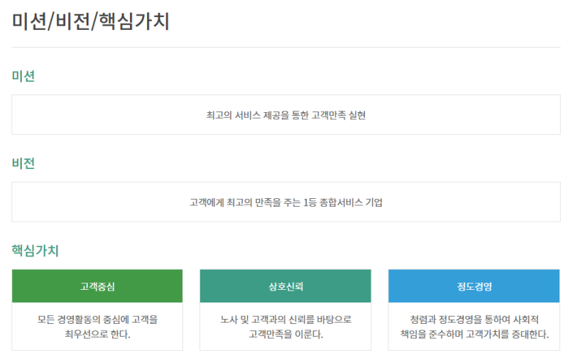 고객 최우선, 품질 혁신, 변화 주도, 인재 존중, 사회 공헌