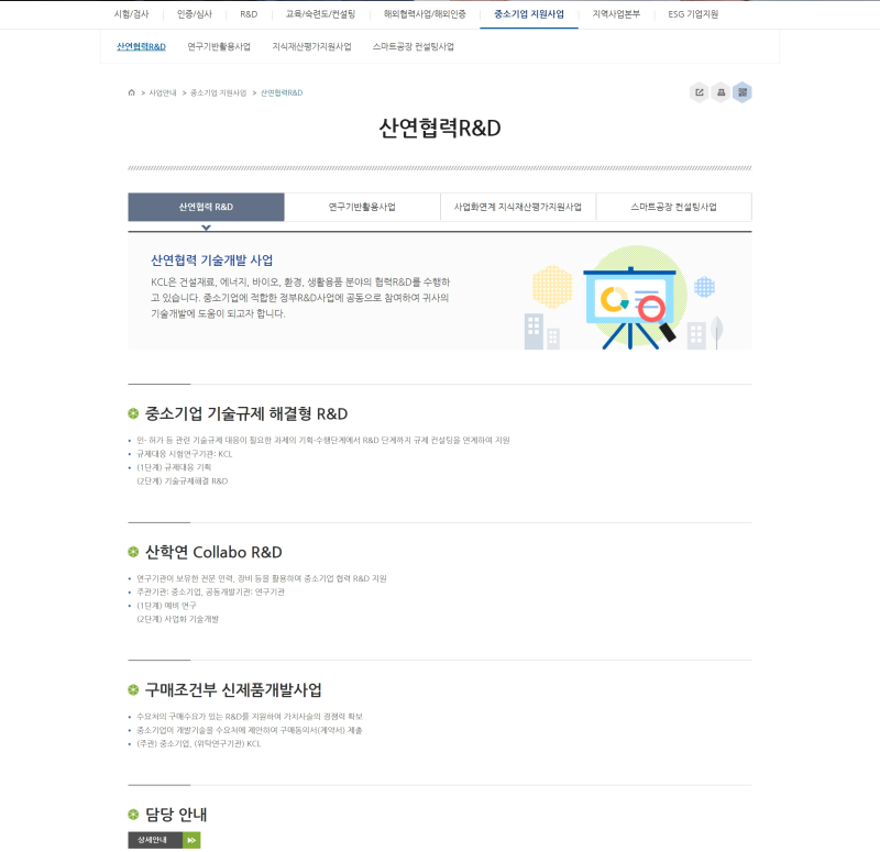 주요 사업: 건축자재 품질 시험, 환경 유해 인자 분석, 에너지 효율 인증 등