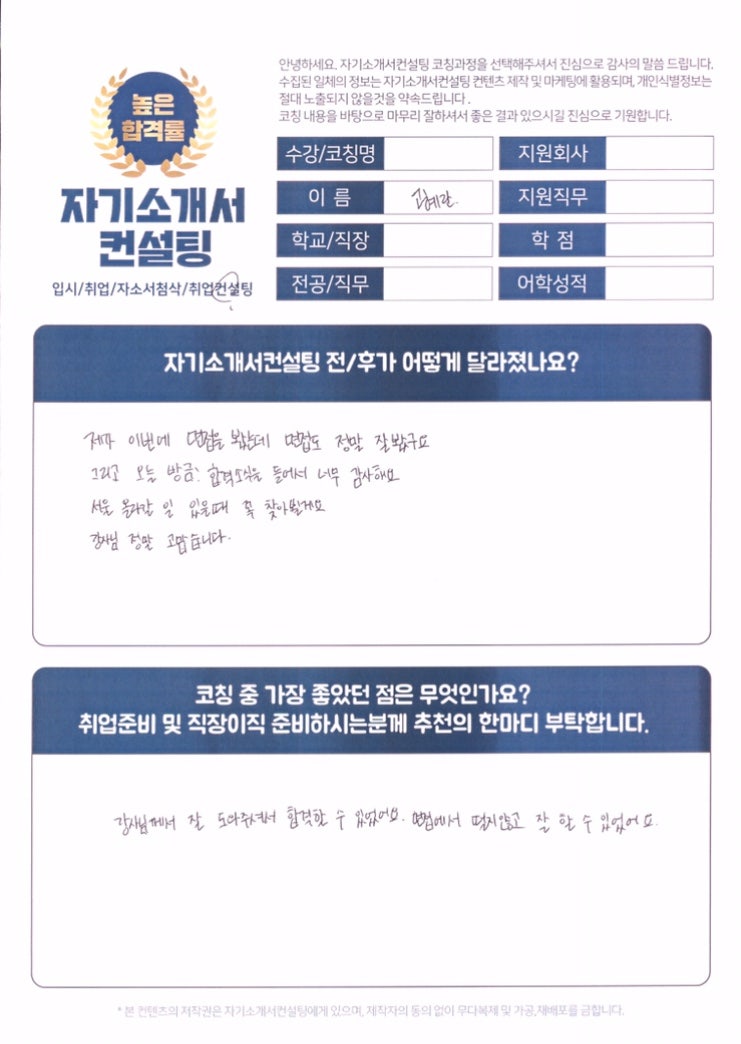 한국정보인증 자소서 첨삭대필 합격후기