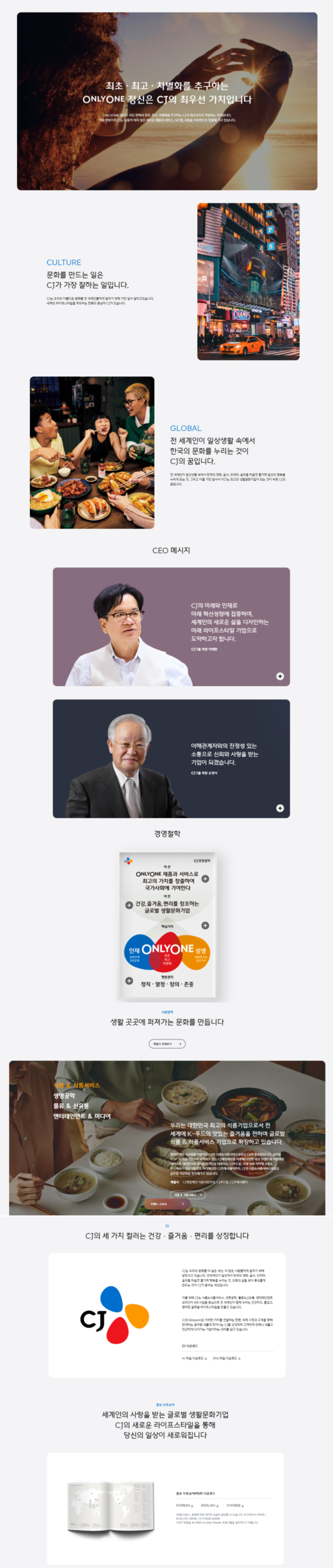 CJ그룹은 ‘OnlyOne’ 정신을 바탕으로 끊임없는 혁신을 추구하며, 글로벌 시장에서도 경쟁력을 강화하고 있습니다. 최근에는 ESG 경영을 강화하며 사회적 책임을 다하는 기업으로서의 면모를 보여주고 있습니다.